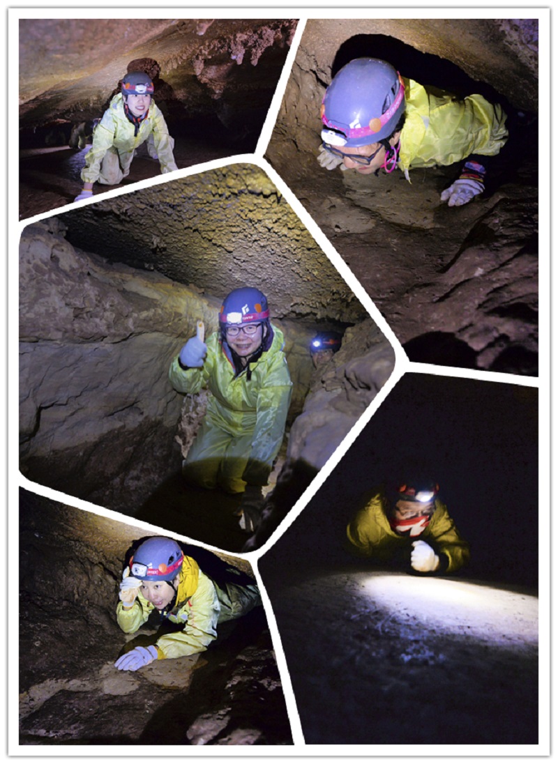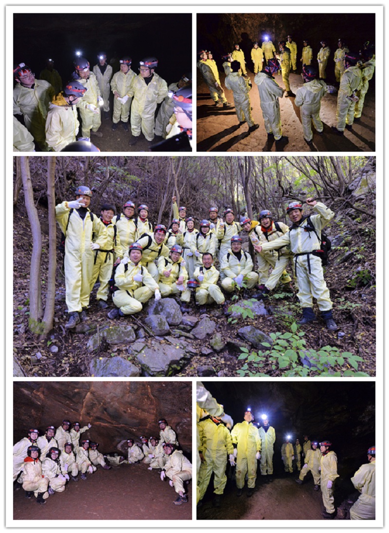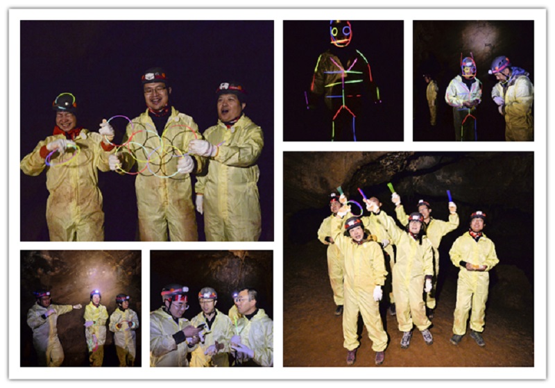 剛走進(jìn)山洞洞口,就感到一股涼氣撲面而來,再加上洞內(nèi)陰森森的,只有頭上那一點(diǎn)兒燈光,還真有那么點(diǎn)兒瘆人。然而這只是開胃小菜,真正的挑戰(zhàn)才剛剛開始。走著走著,洞口變小,想要前進(jìn),就只能彎著腰了。隨著繼續(xù)深入,難度再度升級,來到第二層,開啟半蹲半爬模式。這還沒完呢,難度繼續(xù)升級,來個(gè)全趴的,距離嘛,加長一倍。第三層走起!隨后我們又以小組為天團(tuán),以洞穴為舞臺,帶上熒光棒,讓我們忘掉恐懼與配備,放開心扉,此時(shí)此刻,沒有言語,只有歌聲與歡笑。