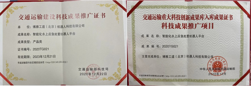 近日,博雅工道收到由交通運輸部頒發(fā)的《交通運輸建設(shè)科技成果推廣證書》和《交通運輸重大科技創(chuàng)新成果庫入庫成果證書》,對博雅工道在海事交通智能化領(lǐng)域做出的突出成績給予的充分肯定。