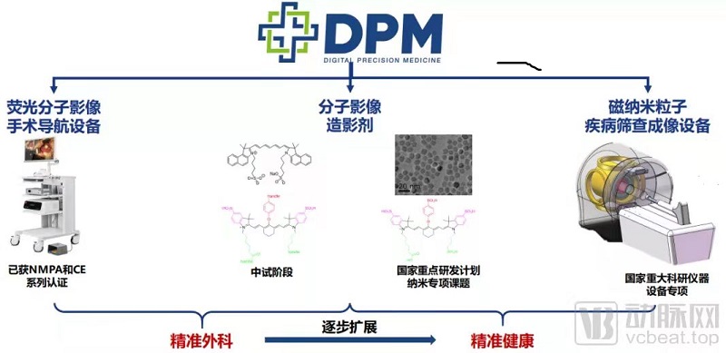 據(jù)DPM介紹,其將從精準(zhǔn)手術(shù)切入,通過熒光分子影像手術(shù)導(dǎo)航設(shè)備布局精準(zhǔn)外科,并依托分子影像造影劑打造“設(shè)備+耗材”閉環(huán)。同時,DPM將憑借磁納米粒子疾病篩查成像設(shè)備進(jìn)入篩查領(lǐng)域,將精準(zhǔn)外科拓展至精準(zhǔn)健康領(lǐng)域。