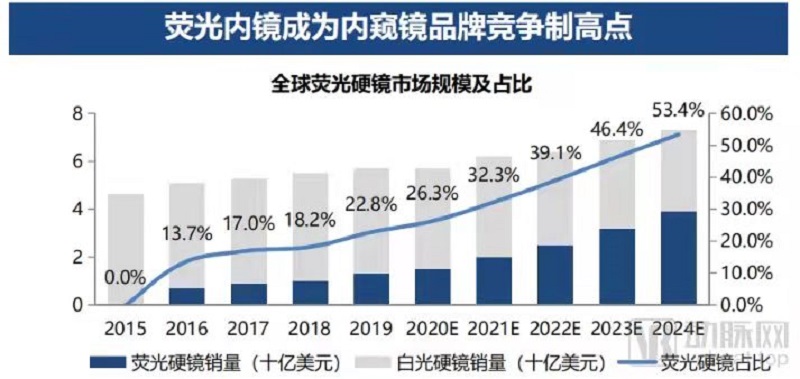 資料顯示,熒光分子影像行業(yè)市場空間正逐年高速增長。如熒光內(nèi)窺鏡正成為全球內(nèi)窺鏡企業(yè)競爭的制高點(diǎn)。據(jù)行業(yè)預(yù)期,熒光內(nèi)窺鏡占比從2016年的13.7%將增長至2024年的53.4%。