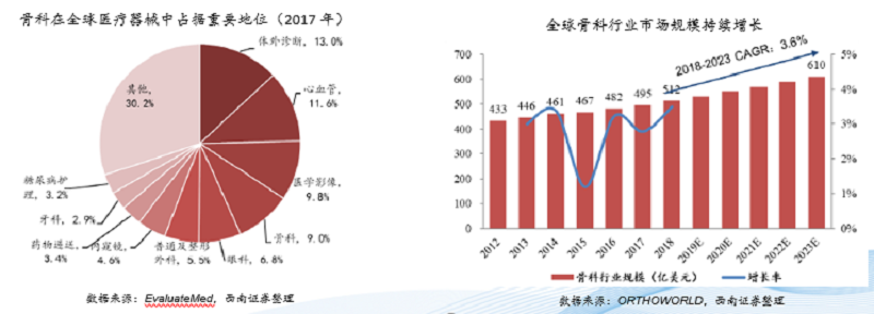 2017年骨科行業(yè)占據(jù)全球醫(yī)療器械9%的市場份額,是第四大細分領(lǐng)域、第三大耗材類細分市場。2012年至2018年,全球骨科市場由433億美元增長至512億美元,年均復合增長率為3%,預計2018-2023年將繼續(xù)以3.6%的年均復合增長率增長,2023年市場規(guī)模將達到610億美元。