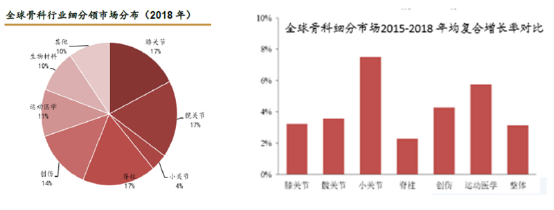 在細分領(lǐng)域,2018年關(guān)節(jié)類產(chǎn)品(膝關(guān)節(jié)、髖關(guān)節(jié)和小關(guān)節(jié))占據(jù)骨科主要市場份額,合計占比為37%,脊柱類占比18%,創(chuàng)傷類占比14%,運動醫(yī)學類占比11%。2015-2018年小關(guān)節(jié)置換和運動醫(yī)學市場年均復合增長率高于行業(yè)整體增長率和其他細分領(lǐng)域增長率,分別為7.5%和5.8%,預計仍將會以6%左右的增速增長。