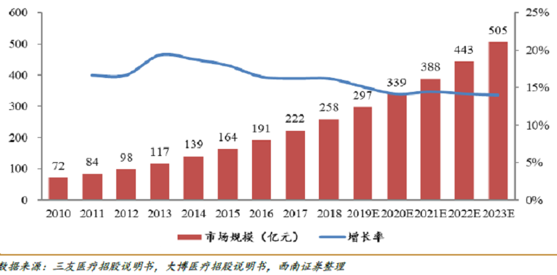 脊柱領(lǐng)域:2013年-2018年國內(nèi)骨科脊柱市場年均復合增長率為17%,2018年市場規(guī)模達到73億,同比增長16%,預計2018-2023年將保持15%的年均復合增長率,2023年市場規(guī)模將超過145億元。