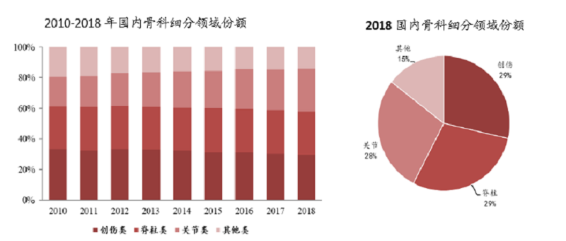 從細分領(lǐng)域看,2010 年至2018 年創(chuàng)傷市場占比持續(xù)降低,關(guān)節(jié)市場占比持續(xù)提升,脊柱市場占比較為穩(wěn)定。2018 年創(chuàng)傷和脊柱類植入物市場占比均接近29%,關(guān)節(jié)類植入物占比略低,市場占比28%,運動醫(yī)學等其他植入物占比約15%。