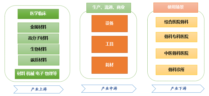 骨科器械產(chǎn)業(yè)鏈來看,上游主要是原材料加工工廠和材料提供商,中游主要是各大產(chǎn)品生產(chǎn)廠家,下游則是服務提供商以及終端醫(yī)院。
