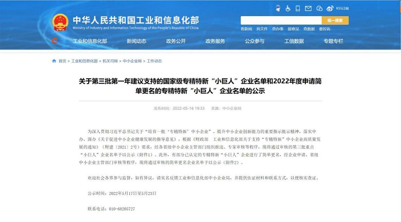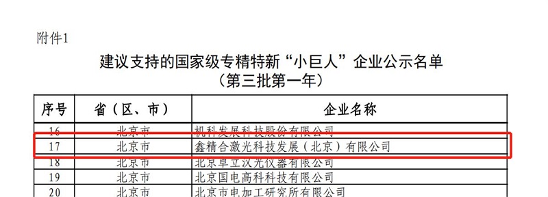5月17日,工業(yè)和信息化部公布了第三批建議支持的國家級專精特新“小巨人”企業(yè)名單,鑫精合激光科技發(fā)展(北京)有限公司喜獲入選!