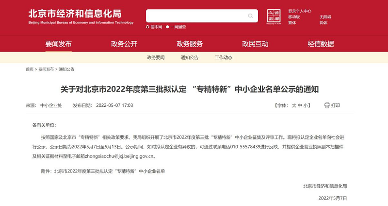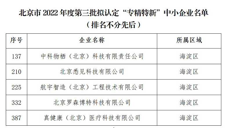 5月7日,北京市經(jīng)濟(jì)和信息化局公布了2022年度第三批擬認(rèn)定 “專精特新”中小企業(yè)名單,中科物棲、悉見科技、航宇智造、羅森博特和真健康等5家金科君創(chuàng)投資的企業(yè)成功入選。