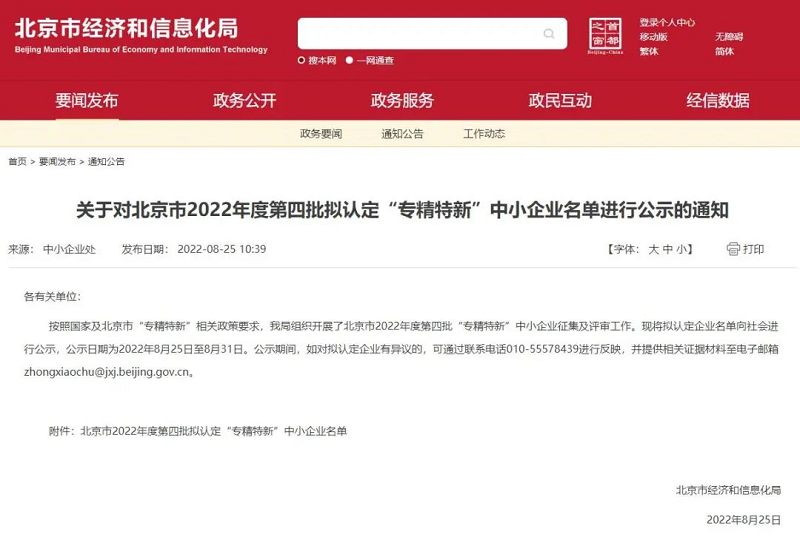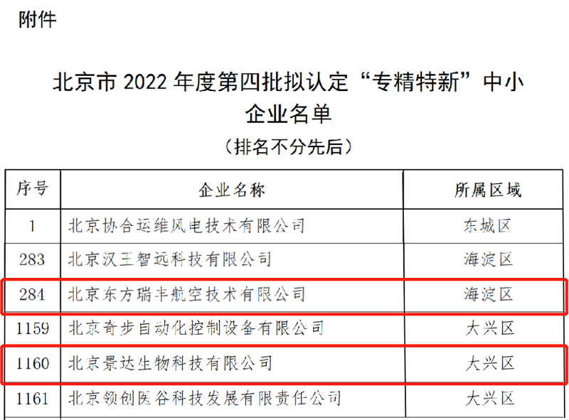 近日,北京市經(jīng)濟(jì)和信息化局公布2022年度第四批擬認(rèn)定“專精特新”中小企業(yè)名單。東方瑞豐、景達(dá)生物通過(guò)專家評(píng)審,榮獲“專精特新”中小企業(yè)稱號(hào),充分體現(xiàn)了政府部門對(duì)企業(yè)自主創(chuàng)新能力和核心競(jìng)爭(zhēng)力的認(rèn)可。