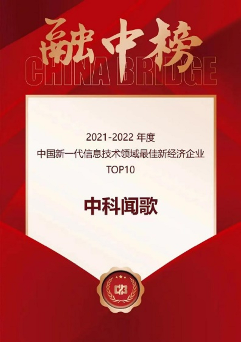 中科聞歌:榮獲“中國(guó)新一代信息技術(shù)領(lǐng)域最佳新經(jīng)濟(jì)企業(yè)TOP10”