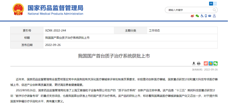 9月26日,國(guó)家藥品監(jiān)督管理局批準(zhǔn)了上海艾普強(qiáng)粒子設(shè)備有限公司生產(chǎn)的“質(zhì)子治療系統(tǒng)”創(chuàng)新產(chǎn)品注冊(cè)申請(qǐng)。該產(chǎn)品是我國(guó)首臺(tái)獲準(zhǔn)上市的國(guó)產(chǎn)質(zhì)子治療系統(tǒng),集成了瑞爾醫(yī)療圖像引導(dǎo)系統(tǒng),可以精確、高效地定位靶區(qū),實(shí)現(xiàn)腫瘤病灶的“精準(zhǔn)清除”。這也標(biāo)志著我國(guó)高端醫(yī)療器械裝備國(guó)產(chǎn)化又邁出一步,對(duì)于提升我國(guó)醫(yī)學(xué)腫瘤診療手段和水平,具有重大意義。