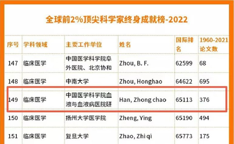 近日,斯坦福大學(xué)發(fā)布了2022年“全球前2%頂尖科學(xué)家榜單”。漢氏聯(lián)合集團(tuán)董事長兼首席科學(xué)家韓忠朝院士榮登臨床醫(yī)學(xué)學(xué)科“全球前2%頂尖科學(xué)家終身成就榜”!