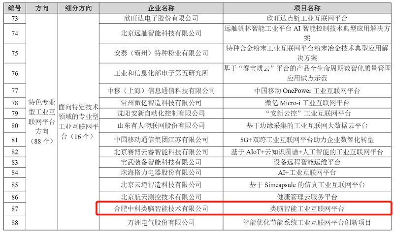 近日,工業(yè)和信息化部公布了《2022年新一代信息技術(shù)與制造業(yè)融合發(fā)展試點示范名單》。其中,面向特定技術(shù)領(lǐng)域的專業(yè)型工業(yè)互聯(lián)網(wǎng)平臺全國共有16個項目入選,金科君創(chuàng)資本投資的合肥中科類腦智能技術(shù)有限公司(簡稱“中科類腦”)位列其中。