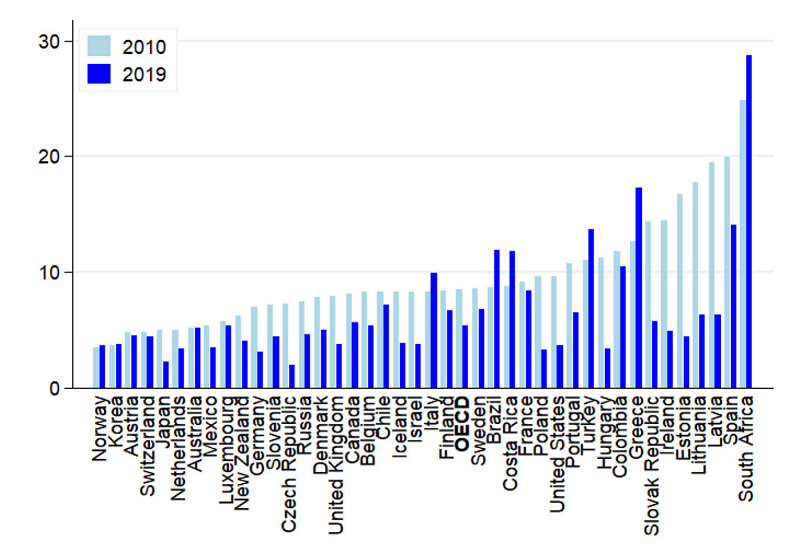 圖1.失業(yè)的演變:經(jīng)合組織和選定的G20國家(2010年與2019年;占總勞動(dòng)力的百分比)