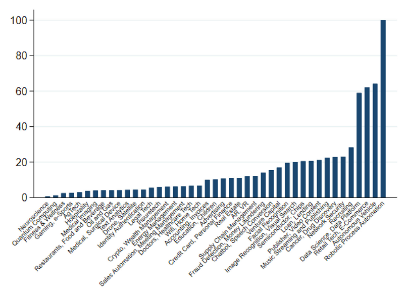 圖2.人工智能發(fā)展的主要領(lǐng)域(2010-2020年,全球累計(jì)投資美元;機(jī)器人過程自動(dòng)化 = 100)