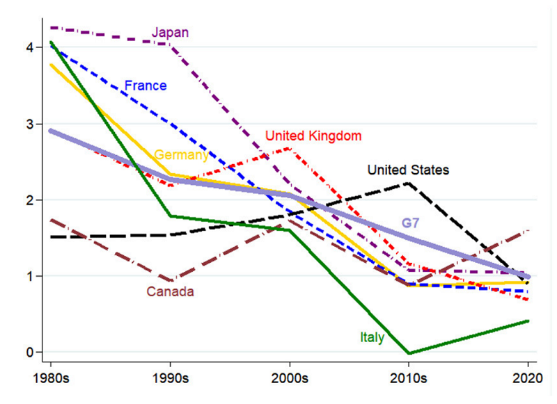 圖3.每小時(shí)勞動(dòng)生產(chǎn)率增長(zhǎng)(1980-2020年,G7國家,十年平均值)