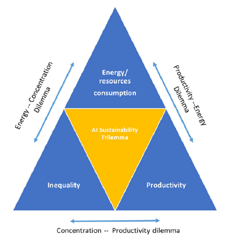 圖4總結(jié)了人工智能可持續(xù)性三元悖論的關(guān)鍵點(diǎn):我們不能同時(shí)擁有低不平等、高生產(chǎn)力和生態(tài)可持續(xù)性,至少在追求人工智能驅(qū)動(dòng)的自動(dòng)化決策系統(tǒng)開發(fā)的當(dāng)前技術(shù)范式時(shí)不能。只有兩個(gè)問題可以同時(shí)解決,而第三個(gè)需要被犧牲。
