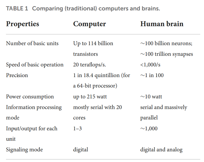 然而,二者的直接比較揭示了性能和效率方面的顯著差異(見表1)。特別是,在能耗和執(zhí)行計(jì)算的精度/速度方面,單個(gè)人類神經(jīng)元相當(dāng)緩慢和不精確。但它們比計(jì)算機(jī)中的晶體管強(qiáng)大得多,顯示出比簡(jiǎn)單的二元激活電位更復(fù)雜的活動(dòng)模式。另一方面,計(jì)算機(jī)可以以更高的速度和精度進(jìn)行計(jì)算,盡管它們中的大多數(shù)處理的晶體管更少,并且連接起來的激活模式要簡(jiǎn)單得多,但這種更高的精度和速度以更高的能耗形式付出了巨大的代價(jià)。