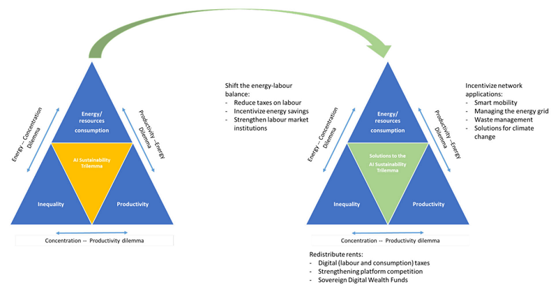 數(shù)字化和人工智能對(duì)工作世界的影響越來越大。大規(guī)模失業(yè)風(fēng)險(xiǎn)的上升引發(fā)了對(duì)技術(shù)的擔(dān)憂。有限的收入和生產(chǎn)力增長(zhǎng)集中在少數(shù)科技公司身上,正在加劇不平等。此外,數(shù)字技術(shù)日益增長(zhǎng)的生態(tài)足跡已經(jīng)成為許多討論的焦點(diǎn)。這造成了技術(shù)進(jìn)步帶來的不平等加劇、生產(chǎn)力增長(zhǎng)緩慢和高生態(tài)成本的三元悖論。怎樣才能解決這個(gè)三元悖論?哪些數(shù)字應(yīng)用應(yīng)該特別推廣?政策制定者應(yīng)該如何應(yīng)對(duì)這個(gè)三元悖論?本文分析了現(xiàn)行工具在這方面的范圍和局限性,并討論了更符合數(shù)字經(jīng)濟(jì)基礎(chǔ)新興技術(shù)范式性質(zhì)的替代辦法,為應(yīng)對(duì)人工智能的社會(huì)經(jīng)濟(jì)挑戰(zhàn)所需的制度創(chuàng)新提出建議。