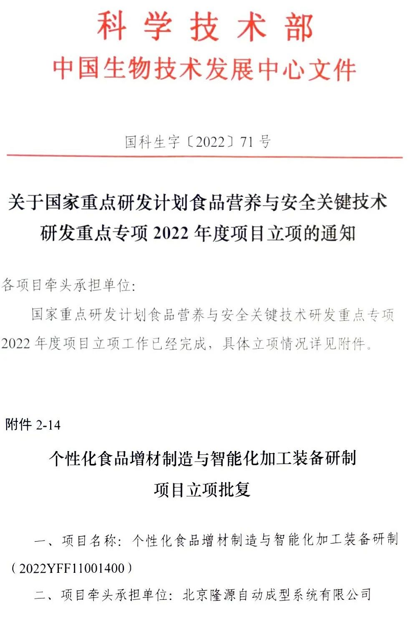 近日,國家重點(diǎn)研發(fā)計劃“食品營養(yǎng)與安全關(guān)鍵技術(shù)研發(fā)”發(fā)布立項(xiàng)通知,由北京隆源自動成型系統(tǒng)有限公司(以下簡稱“隆源成型”)牽頭承擔(dān)的“個性化食品增材制造與智能化加工裝備研制”項(xiàng)目獲得重點(diǎn)專項(xiàng)支持。隆源成型是金科君創(chuàng)資本投資的北京三帝科技股份有限公司(以下簡稱“三帝科技”)旗下企業(yè)。