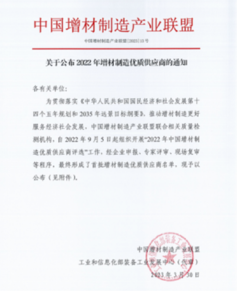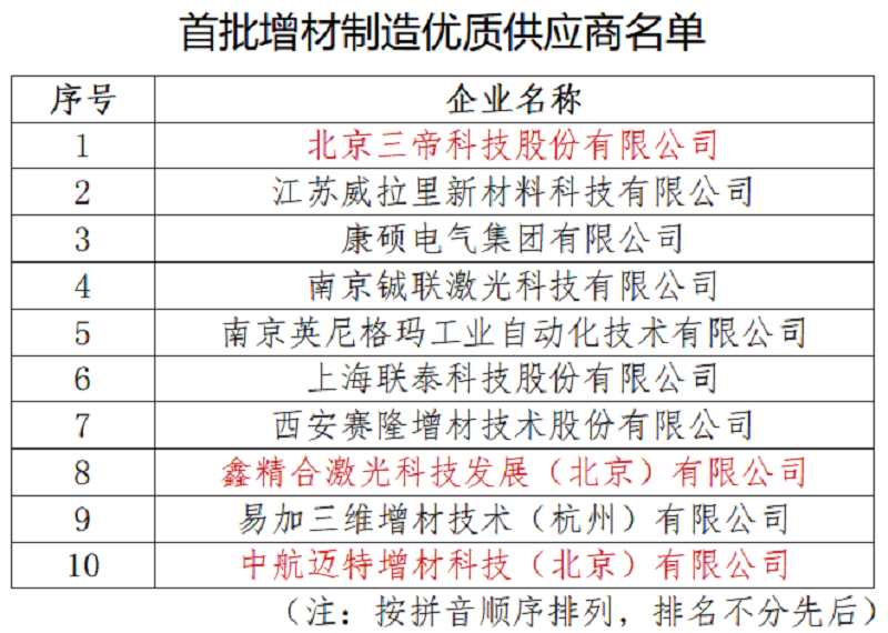 近日,中國增材制造產(chǎn)業(yè)聯(lián)盟公布了“2022年中國增材制造優(yōu)質(zhì)供應(yīng)商”名單。金科君創(chuàng)資本投資的三帝科技、鑫精合、中航邁特3家企業(yè)光榮入選,占榜單企業(yè)數(shù)量的30%,表明企業(yè)的技術(shù)、產(chǎn)品和服務(wù)能力得到權(quán)威認(rèn)可,躋身國內(nèi)增材制造領(lǐng)域一流行列。