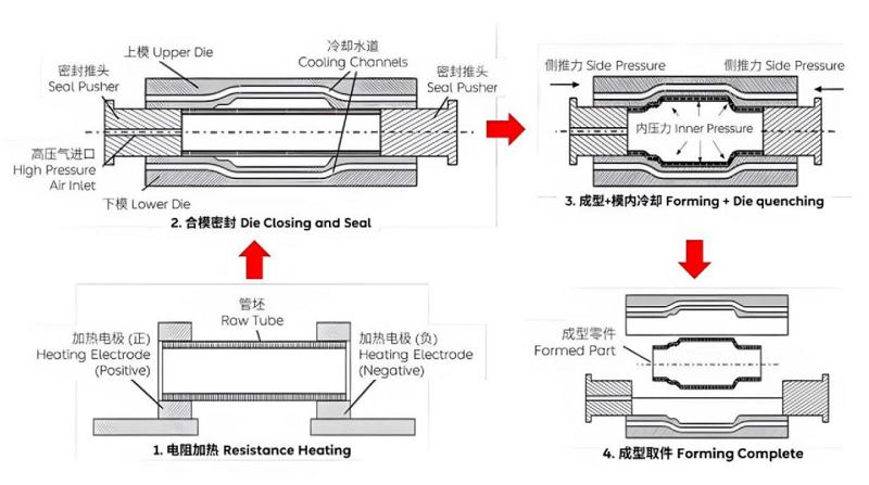在國(guó)家科技重大專項(xiàng)(04專項(xiàng))的支持下,航宇智造自主研發(fā)的"熱氣脹成形技術(shù)"應(yīng)運(yùn)而生。它不僅解決了傳統(tǒng)薄板沖壓點(diǎn)焊管梁結(jié)構(gòu)下,半封閉類型導(dǎo)致力學(xué)性能無(wú)法充分發(fā)揮的痛點(diǎn),而且避免了國(guó)外競(jìng)品技術(shù)路線出現(xiàn)“氫脆現(xiàn)象”的問(wèn)題。