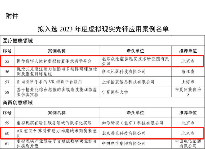 近日,工業(yè)和信息化部對2023年度虛擬現(xiàn)實先鋒應用案例名單進行公示。經過地方推薦和專家評審,金科君創(chuàng)投資的北京眾繪虛擬現(xiàn)實技術研究院有限公司(簡稱“眾繪科技”)和北京悉見科技有限公司(簡稱“悉見科技”)光榮入選。