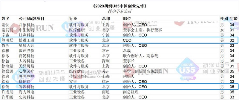 近日,提供全球最大獨(dú)角獸及未來獨(dú)角獸榜單的胡潤研究院發(fā)布《2023胡潤U35中國創(chuàng)業(yè)先鋒》(Hurun China Under35s 2023),旨在尋找中國36歲以下的創(chuàng)業(yè)先鋒。共有來自241家企業(yè)的251位中國U35創(chuàng)業(yè)先鋒榮登榜單。君創(chuàng)Family企業(yè)博雅工道CEO熊明磊和智齒科技CEO徐懿榮耀入選。