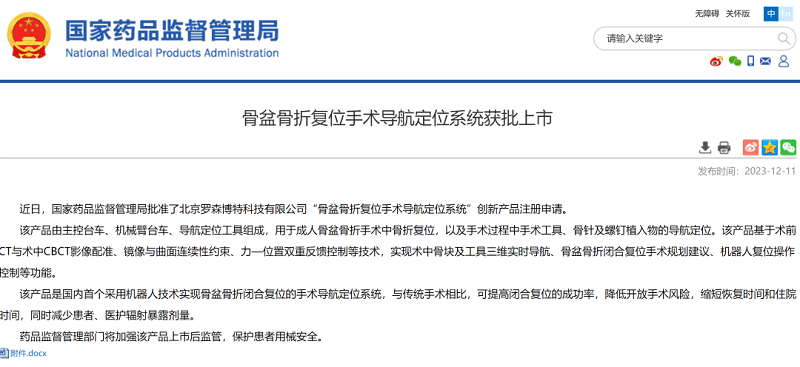近日,北京羅森博特科技有限公司(簡稱“羅森博特”)“骨盆骨折復(fù)位手術(shù)導(dǎo)航定位系統(tǒng)”創(chuàng)新產(chǎn)品注冊申請獲得國家藥品監(jiān)督管理局(NMPA)批準(zhǔn),取得第三類醫(yī)療器械注冊證。