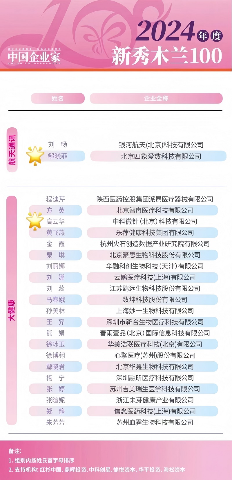 近日,《中國企業(yè)家》雜志社首次發(fā)布“新秀木蘭100”名單, 2位金科君創(chuàng)投資企業(yè)的創(chuàng)始人從眾多候選精英企業(yè)家中脫穎而出,光榮入選。她們是北京四象愛數(shù)科技有限公司郗曉菲董事長、中科微針(北京)科技有限公司高云華董事長。