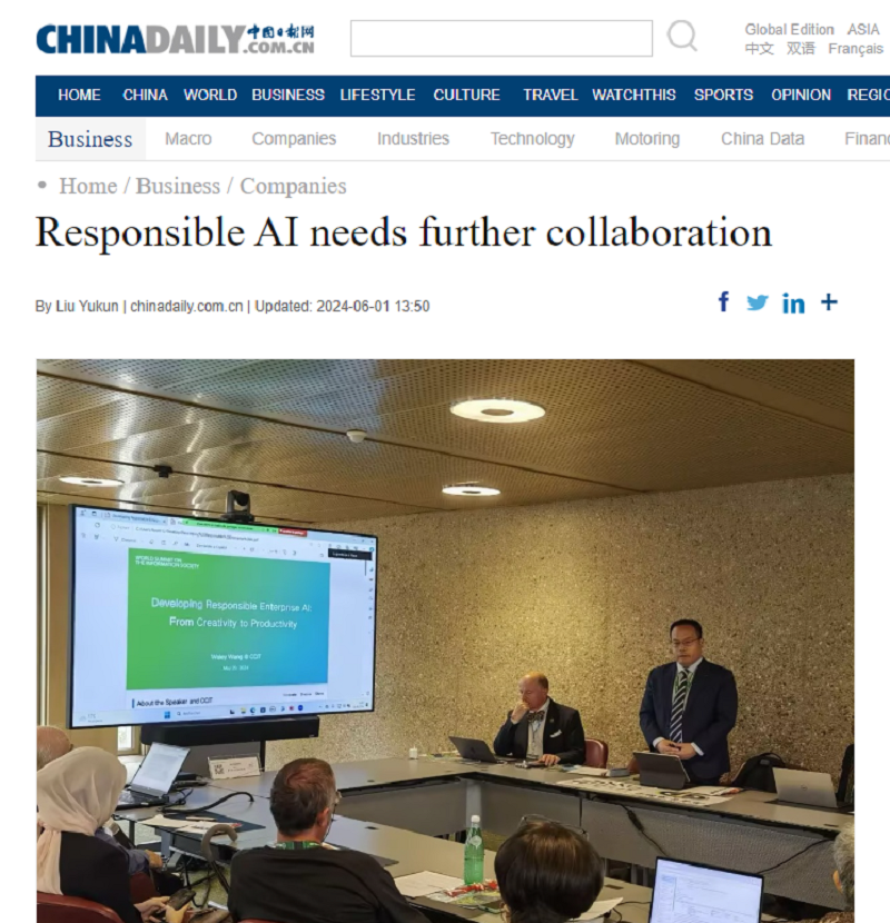 近日,2024年信息社會世界峰會 (WSIS+20)高級別活動在瑞士舉行,君創(chuàng)Family企業(yè)中科聞歌董事長王磊應(yīng)邀參加“人工智能與全球挑戰(zhàn)”會議,并作為主要發(fā)言人作《研發(fā)負(fù)責(zé)任的企業(yè)級AI:從創(chuàng)造力到生產(chǎn)力》主題報告。中國日報China Daily對此進(jìn)行了報道。