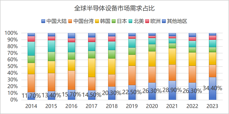 半導體設備貫穿于芯片制造、封裝和測試等關鍵環(huán)節(jié),是半導體產業(yè)的基石。從產業(yè)鏈全景來看,半導體設備不僅支撐著芯片制造的復雜工藝,還與材料、設計等領域緊密相連。全球半導體設備市場在過去幾年間持續(xù)增長,2023年市場規(guī)模已達到數(shù)千億美元,其中中國市場占比接近三分之一,成為全球最大的設備需求市場之一。