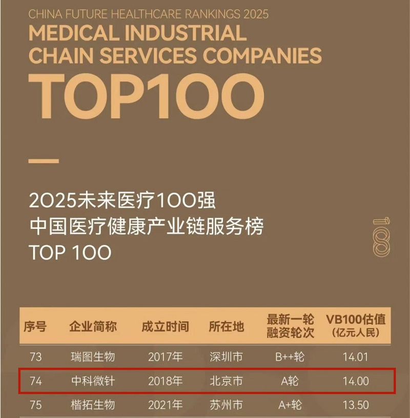 中科微針入選“中國醫(yī)療健康產(chǎn)業(yè)鏈服務(wù)榜 TOP 100”
