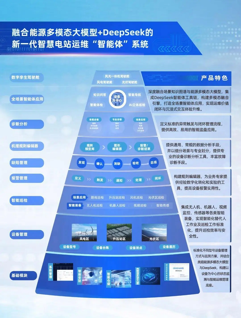 此外,平臺(tái)依托DeepSeek大模型與類腦多模態(tài)技術(shù)強(qiáng)化AI診斷能力,結(jié)合規(guī)則編輯器將專家經(jīng)驗(yàn)數(shù)字化,優(yōu)化故障預(yù)警與閉環(huán)管理;同時(shí),集成無人機(jī)、機(jī)器人等智能裝備,實(shí)現(xiàn)巡檢工作的智能化替代,提升巡檢效率與安全性。通過標(biāo)準(zhǔn)化不同型號(hào)設(shè)備的管理方式與監(jiān)測(cè)方案,平臺(tái)實(shí)現(xiàn)了以設(shè)備為中心的狀態(tài)監(jiān)測(cè)與運(yùn)維管理,推動(dòng)新能源行業(yè)的智能化轉(zhuǎn)型升級(jí)。