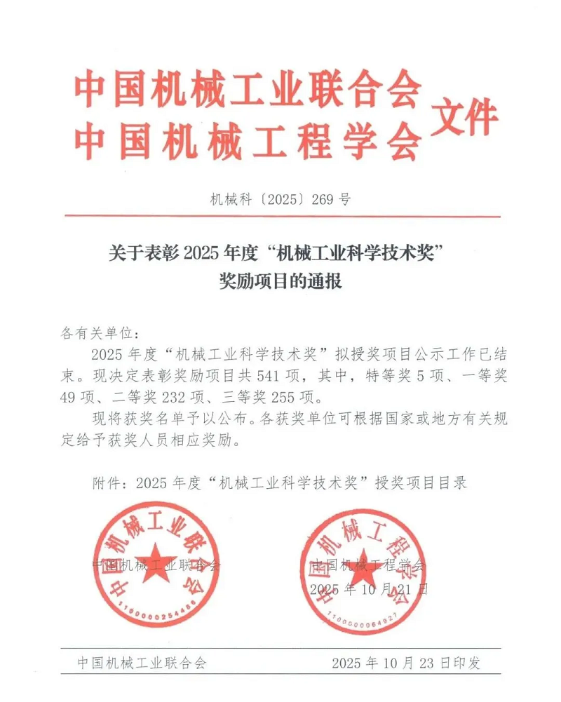 “機械工業(yè)科學技術(shù)獎”是經(jīng)國家科學技術(shù)部批準,由中國機械工業(yè)聯(lián)合會和中國機械工程學會共同設(shè)立的全國性綜合性科技獎項,在國家科技獎勵主管部門正式登記,是機械行業(yè)最具權(quán)威性的科技榮譽之一。該獎項每年評審一次,旨在表彰推動機械工業(yè)科技進步、提高行業(yè)綜合實力的突出貢獻者,其一等獎項目要求達到國際先進水平、技術(shù)難度極大,且對國民經(jīng)濟建設(shè)具有重大作用,經(jīng)實踐驗證具備顯著經(jīng)濟效益與社會效益。